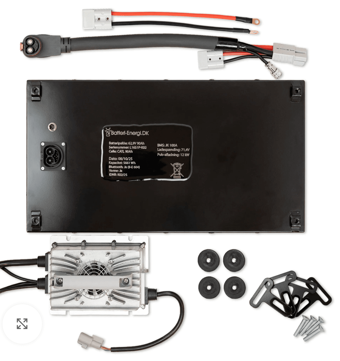 Alle batterier leveres med tilpasset kabelsæt og indbygget varme, der automatisk slår til, når laderen starter.